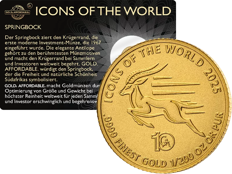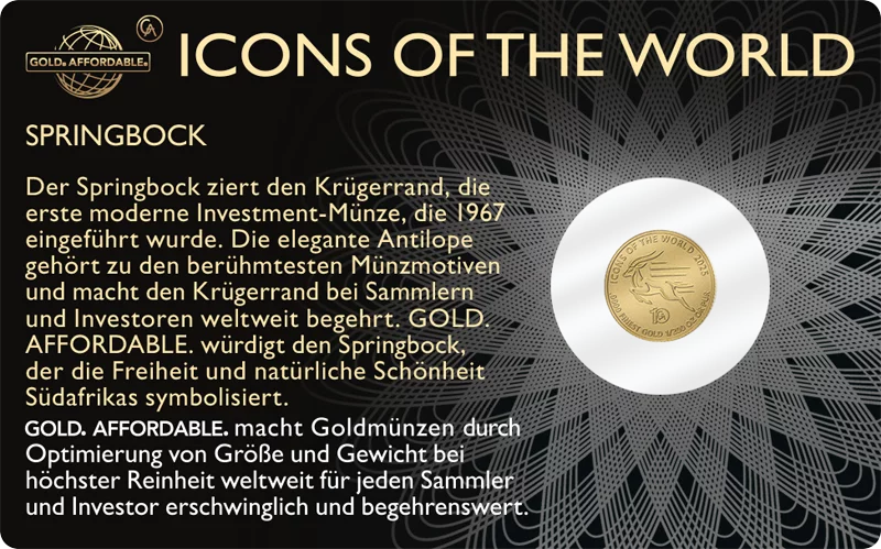 Der Springbock ist DIE Investment-Ikone schlechthin. 1967 zierte er erstmals den weltberühmten Krügerrand und ist seitdem zum Symbol für die Stabilität und Krisensicherheit von Gold avanciert. In Deutschland ist der Krügerrand sogar die meistgekaufte Anlage-Goldmünze überhaupt. Nun wird der Springbock auf einer Münze aus reinem 9999 Gold gewürdigt.