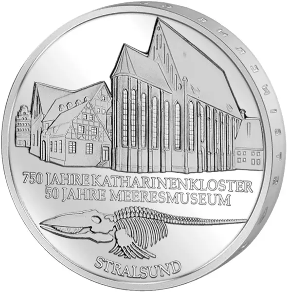 Die vorletzte 10-DM-Gedenkmünze der BRD vor der Einführung des Euro ist gleich zwei Jubiläen gewidmet: dem 750. Jahrestag der Gründung des Katharinenklosters in Stralsund und dem 50-jährigen Jubiläum des Deutschen Meeresmuseums, das sich in den Räumen des Klosters befindet.