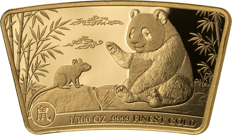 Dieser Münzbarren aus reinem 9999 Gold begeistert mit dem Motiv eines friedlichen Pandas, der sich einer Ratte gegenübersieht. Filigran geprägt in hervorragender „Prooflike“-Qualität ist vor allem die außergewöhnliche Fächerform des Barrens ein echtes Highlight.
