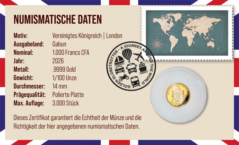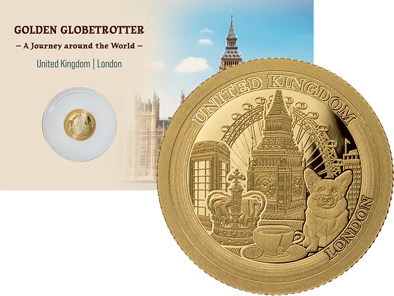 Nun erwartet Sie Londons einzigartiger Flair auf dieser exklusiven Ausgabe aus der Kollektion „Golden Globetrotter“. Aus reinem 9999 Gold geprägt, begeistert dieser Sammlerschatz mit seinem äußert detailreichen Motiv. Doch nicht nur das: Aufgrund einer Auflage von lediglich 3.000 Exemplaren weltweit ist diese Münz-Rarität streng limitiert. Greifen Sie daher gleich zu und holen Sie sich Ihr persönliches Exemplar in der exklusiven Coin Card!