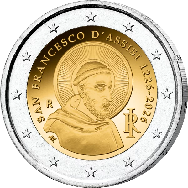 Mit dieser 2-Euro-Gedenkmünze würdigt Italien den 800. Todestag von Franz von Assisi im Jahr 2026. Das Motiv zeigt den Heiligen im Porträt, nach der Vorlage eines berühmten Freskos von Simone Martini in der Basilika San Francesco in Assisi. Sein Kopf wird von einem Heiligenschein gekrönt.