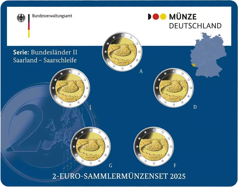 5 x 2 Euro BRD Saarland Saarschleife 2025 Polierte Platte (A-J) inkl. Blister