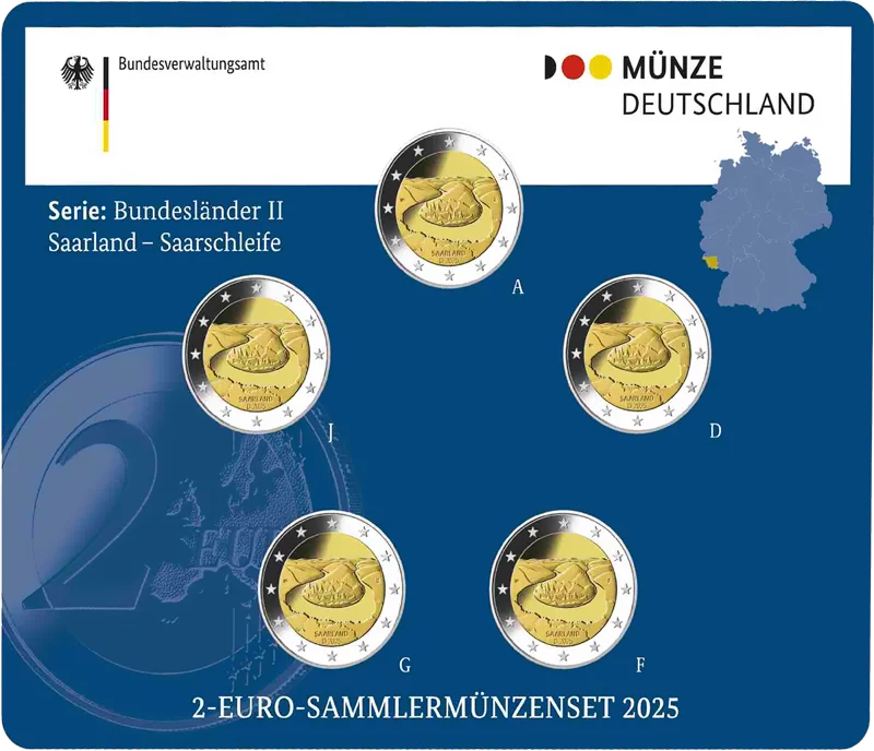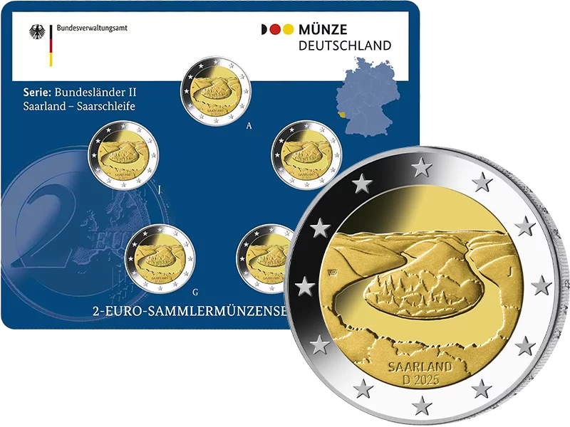 Die 2-Euro-Gedenkmünze 2025 „Saarland - Saarschleife“ ist Teil der zweiten Bundesländerserie. Die erfreut sich bei Münzfreunden großer Beliebtheit. Sichern Sie sich jetzt den kompletten Satz der brandaktuellen 2-Euro-Gedenkmünze aus allen 5 deutschen Prägestätten, versehen mit den jeweiligen Prägekennzeichen, in höchster Prägequalität „Polierte Platte“ und im offiziellen Blister! Sehr zu empfehlen!
