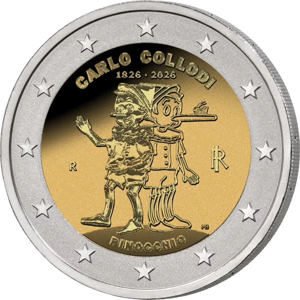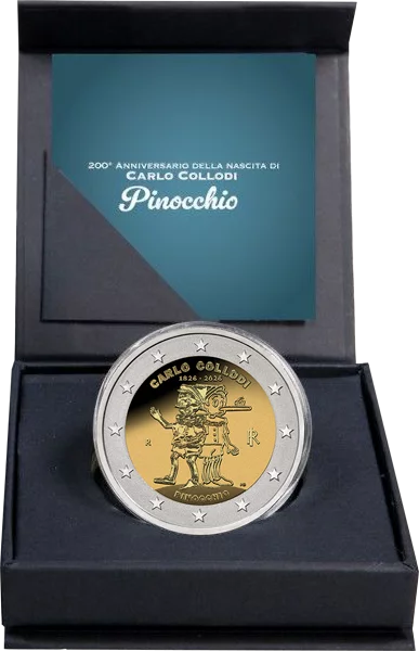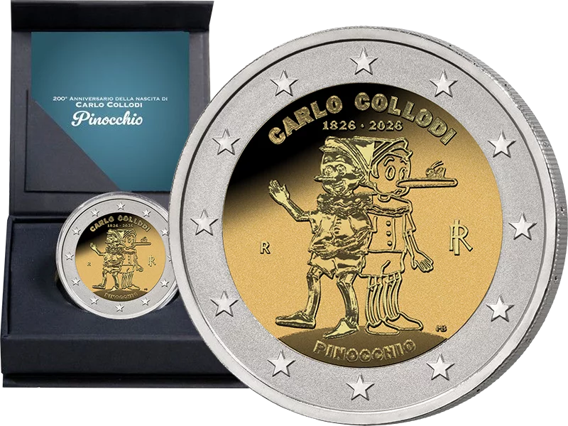 Zum 200. Geburtstag von Carlo Collodi, dem Schöpfer von Pinocchio, gibt Italien im Jahr 2026 eine eigene 2-Euro-Gedenkmünze in seltener „Reverse Proof“-Qualität aus. Das Motiv zeigt Pinocchio sowohl als Holzpuppe als auch als echten Jungen zusammen mit dem Schriftzug „Carlo Collodi 1826 – 2026“. Eingefasst in ein edles Etui mit Zertifikat wird Ihr Sammlerstück perfekt geschützt und würdig präsentiert.