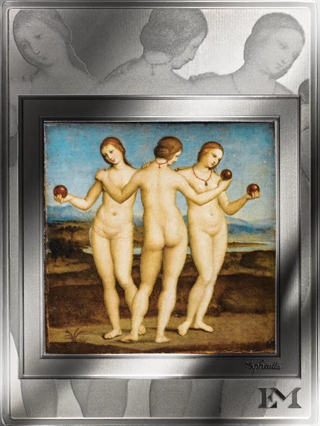 Diese eindrucksvolle Ausgabe der Kollektion „Ewige Meisterwerke“ zeigt das weltberühmte Motiv „Die drei Grazien“ des italienischen Malers Raffael. Das Werk der Hochrenaissance erhält durch die kunstvolle Umsetzung eine neue, greifbare Dimension. Kunst und edles Metall werden auf einzigartige Weise kombiniert.
